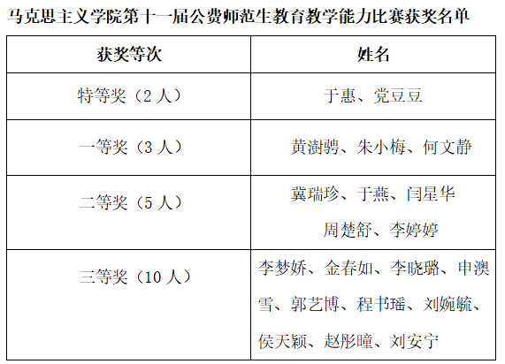 最终于惠等两名同学获特等奖、黄澍骋等三名同学获一等奖、冀瑞珍等五名同学获二等奖、李梦娇等10位同学获三等奖。此次比赛的成功举办充分调动了公司师范生提升自身教学技能、厚实个人理论储备的积极性,对提高公司思政专业师范生培养质量,推动大中小学思政课一体化建设具有重要意义。